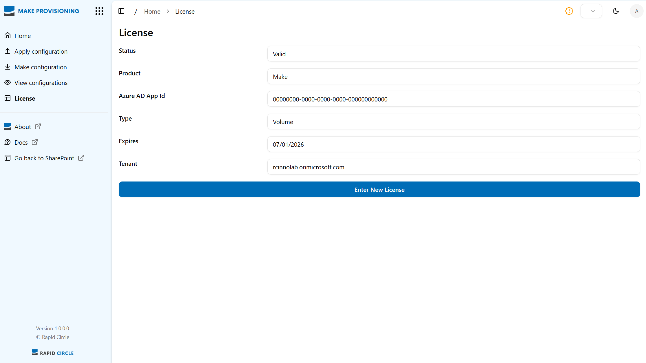 The License page in the Make Provisioning Tool displays the current licence details for the application. It enables administrators to view licence status, product information, and tenant details, as well as update the licence when required.