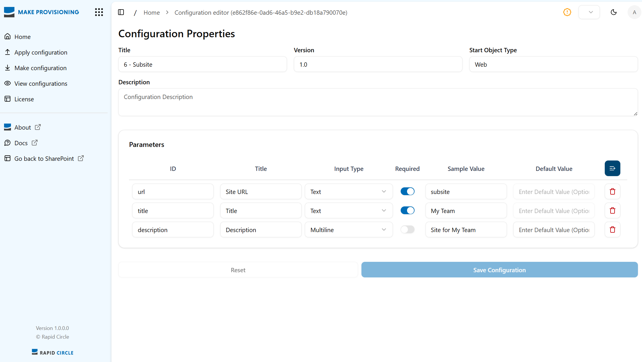 Pre-filled when applying the configuration—useful for parameters that rarely change (e.g., Site Collection Admin).